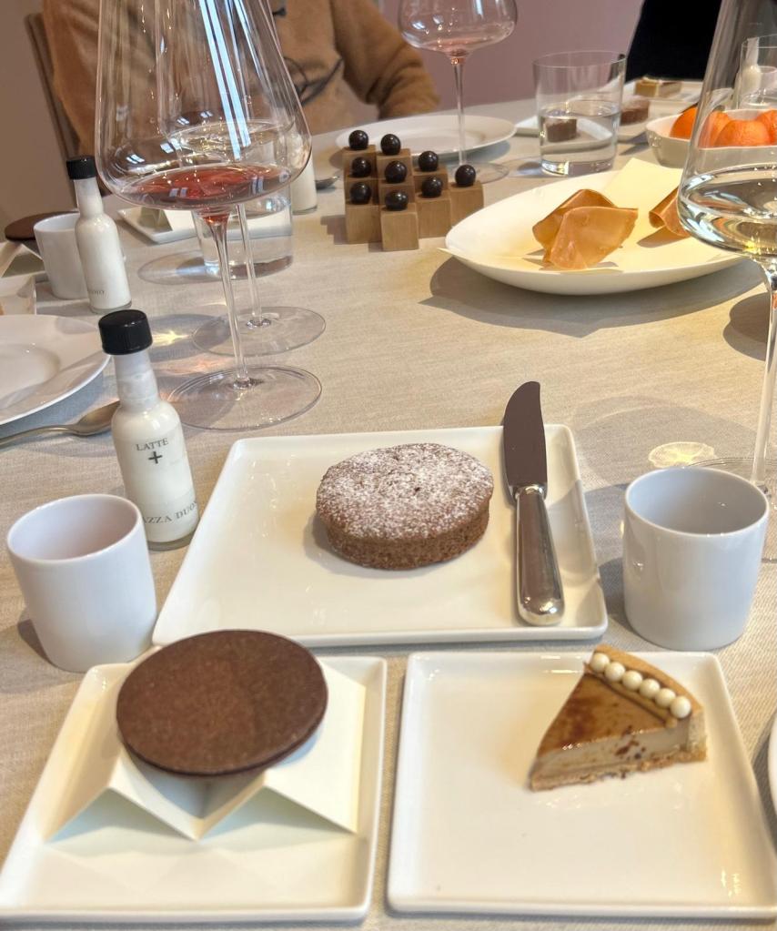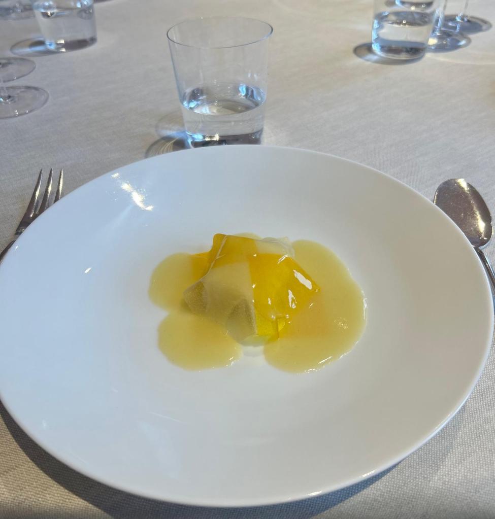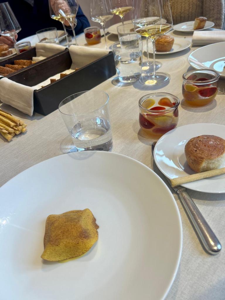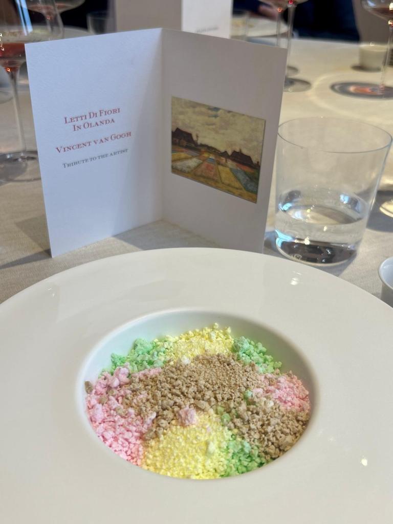 La cucina dello chef Enrico Crippa si presenta con tre menù degustazione: uno strettamente legato agli orti e alle stagioni, l’altro in estrema intimità con il territorio e l’ultimo propenso ad un viaggio lungo l’Italia e oltre confine. Quest’ultimo il nostro.